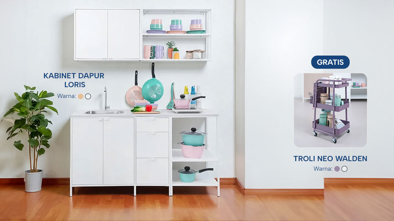 Beli kabinet ini, kamu juga langsung dapat Kitchen Trolley Neo Walden gratis. Trolinya pakai roda, gampang dipindah sesuai kebutuhan. Butuh ruang simpan tambahan di dapur atau sudut lain rumah, geser aja! Simpel dan fleksibel buat dipakai setiap hari.