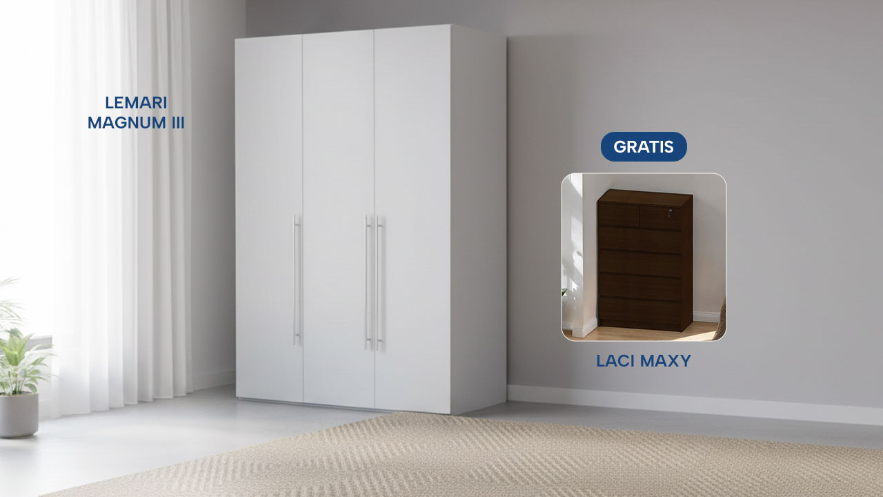 Masuk ke kamar, saatnya beresin biar makin lega. Lemari 3 Pintu Magnum punya ruang simpan yang luas, dengan desain minimalis yang gampang di-mix & match ke berbagai style kamar. Di dalamnya ada kompartemen gantungan dan rak, baju tertata rapi dan siap dipakai Lebaran.