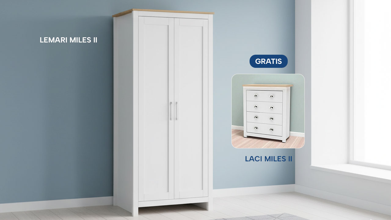 Nggak cuma lemari, kamu juga bawa pulang Laci Miles 2 gratis yang tampilannya serasi. Kombinasi ini bikin kamar kelihatan lebih rapi dan terkonsep. Bisa kamu letakkan di samping kasur atau sofa buat simpan aksesoris dan perintilan biar nggak berantakan.