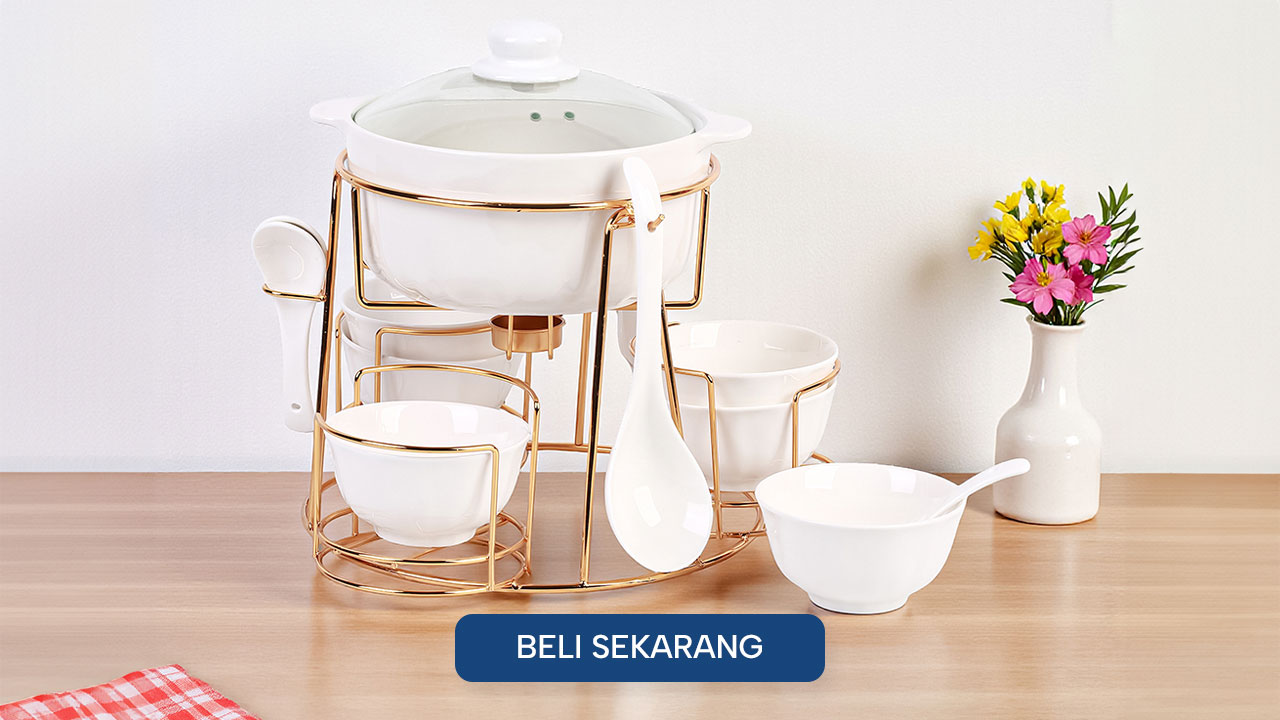 Supaya meja makan terlihat lebih hidup, coba tambahkan mangkuk saji sebagai bagian dari dekorasi sekaligus tempat hidangan. Sobat INFORMA bisa memilih Mangkuk Saji Porcelain Set 7 Pcs Sana dengan Rak, yang terbuat dari material porcelain food-grade berkualitas tinggi. Desainnya yang minimalis dan elegan mudah dipadukan dengan konsep ruang makan apa pun, dari modern sampai klasik. Set ini juga mudah dibersihkan dan cocok digunakan untuk acara spesial seperti makan malam Natal. Dalam satu set, kamu sudah mendapatkan wadah sup dengan tutup, enam mangkuk kecil, enam sendok kecil, satu sendok besar, dan rak penyangga. Dengan Mangkuk Saji Porcelain Set 7 Pcs Sana dengan Rak, Sobat INFORMA bisa menyajikan hidangan dengan praktis sekaligus memperindah momen kebersamaan bersama orang-orang tersayang di rumah.